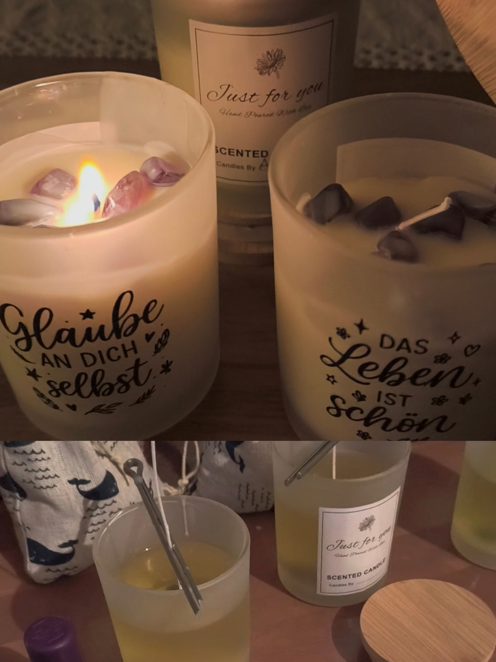 Jede meiner Kerzen entsteht aus Liebe, Achtsamkeit und Intuition. Handgegossen aus reinem Sojawachs, veredelt mit kraftvollen Aromaölen und ausgewählten Heilsteinen zu deinem Thema. Die Kerzen sind mehr als Licht - sie sind ein Ritual für dein Wohlbefinden, ein Moment nur für dich, eine Einladung, deine innere Kraft zu spüren. Jede Kerze trägt die Energie die es gerade braucht-ein täglicher Reminder an deine Stärken. Beim Abbrennen entfaltet sich nicht nur der Duft, sondern auch die Edelsteinwirkung. Ein Erlebnis für Sinne & Seele.